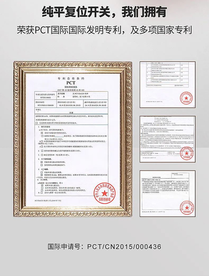 二、在技術(shù)上,它擁有關(guān)于純平復(fù)位開關(guān)的發(fā)明專利。十余年的技術(shù)沉淀,使得產(chǎn)品結(jié)構(gòu)的可靠性及穩(wěn)定性優(yōu)越。
