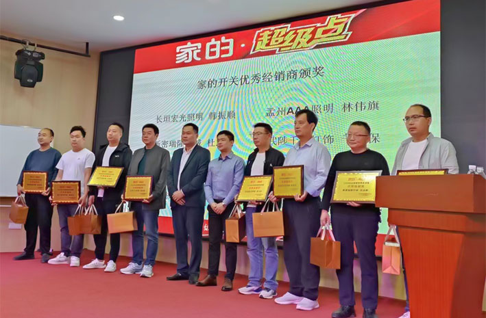 接下來,家的中西部銷售總監(jiān)李曉耀發(fā)表講話。他從中山市家的電器有限公司的發(fā)展歷史,研發(fā)、生產、檢測的實力,以及家的開關品牌的知名度、影響力等進行了全方位的講解。他重點講解家的公司現階段主推的核心差異化品類——超級點。他分析超級點開關的競爭優(yōu)勢和賣點等。特別是近期的新品——V20膚感白超級點受市場熱捧,供不應求,見證了超級點市場競爭力強的優(yōu)勢。他還介紹了家的魔方旋轉柜、智能燈箱等獨特的終端展示方式。他的講話內容,增強了經銷商銷售家的產品的信心!